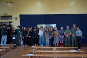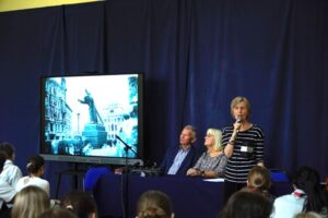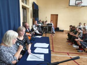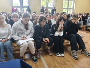 W dniu 23 października 2025 roku odbyło się w XXV Liceum Ogólnokształcącym spotkanie z p. Krystyną Woźniak, autorką, wydanego z okazji 80 rocznicy wybuchu Powstania Warszawskiego, tomiku poezji “Niebo pękało sierpniem”. Z tej okazji grupa 150 uczniów naszej szkoły – głównie z klas humanistycznych – mogła obejrzeć program poetycko-muzyczny. Podczas spotkania zaprezentowane były wiersze w tomiku w wykonaniu p. Krystyny Woźniak i p. Marzeny Szumlańskiej – Śron, wzbogacone oprawą muzyczną – p. Czesław Ganda, p. Stanisław Dobrzański, p. Jacek Kostyszak. Do udziału w programie zaproszono także uczniów, którzy wykonywali wspólnie z występującymi niektóre piosenki. Interesującym elementem były również zaprezentowane na telebimie zdjęcia z archiwum Muzeum Powstania Warszawskiego.